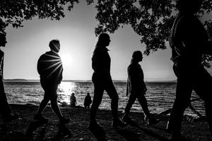 Along the shoreline, silhouettes cross paths beneath a sinking sun. Each person moves at their own pace, yet all are held within the same fading band of light — a brief communion before dusk.