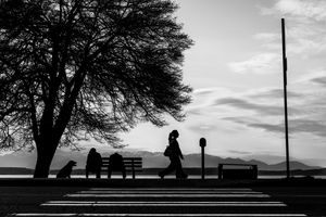 A woman crosses through the last light of day as two others sit facing the water. The scene rests between motion and pause — a quiet rhythm at the edge of departure.